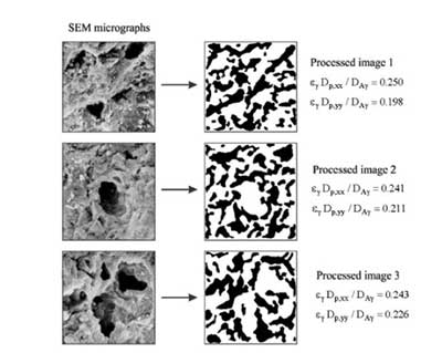 通過掃描電子顯微鏡使用2400倍放大倍數(shù)檢查活性炭的形態(tài)。使用圖像處理工具箱處理圖像。程序如下。首先,通過將灰度轉(zhuǎn)換為灰度(從0(黑色)到255(白色)]來改善黑暗和光照區(qū)域之間的對比度。由于深色區(qū)域在視覺上指示深刻,所以假設這些代表孔隙占據(jù)的部分,而淺色區(qū)域與固體基質(zhì)(活性炭)有關(guān)。這個想法一點,每個象素的灰度值被跟蹤(來自黑色),并累積,得到體積分數(shù) ε γ 的較暗的像素。其次,具有等于或小于閾值的值的所有像素被轉(zhuǎn)換成白色(被孔占據(jù)的空間),而具有較高值的​​像素被轉(zhuǎn)換成黑色(實心矩陣)。最后,為了增強輪廓的定義,應用濾波器。這個程序允許我們獲得最終的二值圖像,其中白色和總像素數(shù)之間的比率等于活性炭的孔隙率。事實上,來自SEM顯微照片的處理圖像提供了解決閉合問題的領(lǐng)域。