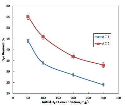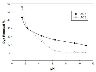 初始染料濃度在50〜300 mg L -1檸檬黃對AC1和AC2吸附效率的影響,結果如圖2所示。從圖中可以看出,隨著酒石黃初始濃度的增加,酒石黃脫除百分比降低。雖然吸附百分比隨初始染料濃度的增加而降低,但每單位質(zhì)量吸附劑吸附染料的實際量隨著試驗溶液中染料濃度的增加而增加。為AC1的單元吸附從10.85增加MGG -1至35.70 MGG -1作為供試品溶液的酒石黃濃度從50 MGL增加-1至300 MGL -1。類似大號 Y,對AC2單元吸附從14.05增加MGG -1至50.1 MGG -1作為染料濃度從50 MGL增加-1至300 MGL -1。