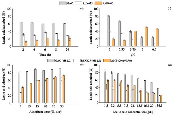 目前的研究表明,活性炭是一種好的吸附劑。然而,吸附在吸附劑上的乳酸的量不能作為選擇合適吸附劑的唯一參數(shù)。另外,活性炭的吸附能力經(jīng)過不同的吸附和解吸循環(huán)后可以降低,因此活性炭的長(zhǎng)期性能對(duì)選擇最經(jīng)濟(jì)可行的材料至關(guān)重要。從吸附劑中解吸乳酸是一個(gè)重要的因素,需要作為下游加工策略來考察,但超出了本研究的范圍。