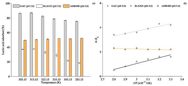 圖2. (a)溫度(30-80°C)對(duì)本體溶液中4.5 g / L乳酸吸附容量的影響伴隨著初始pH校正和10%(w / v)吸附劑劑量(b)在30-80°C的溫度范圍內(nèi),在4.5g / L的乳酸濃度下ln K L相對(duì)于1 / T的圖。