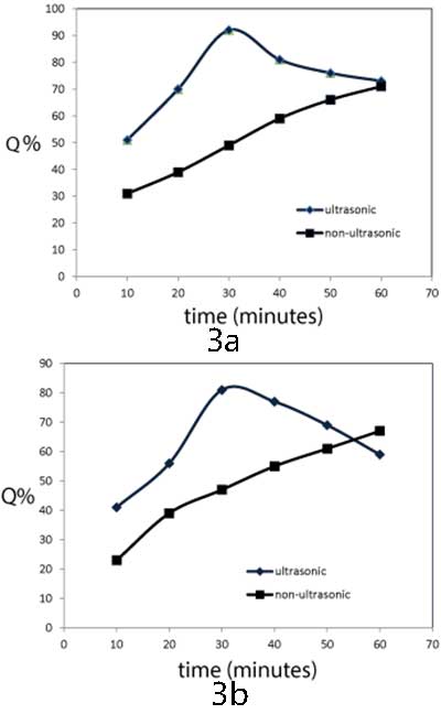超聲處理時(shí)間對(duì)鉻和鋅離子的去除效率的影響通過在存在和不存在的情況下將0.05g MFT / 活性炭與50mL Cr 3+和Zn 2+溶液(100mg / L)頻率為210kHz的超聲波,聲強(qiáng)為7.7W / cm。結(jié)果如圖3a和3b所示。