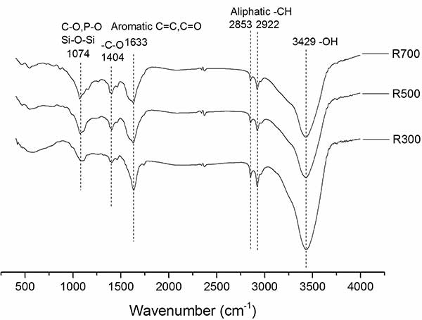 圖1.來(lái)自原料熱解的活性炭的變換紅外(FTIR)光譜分析。