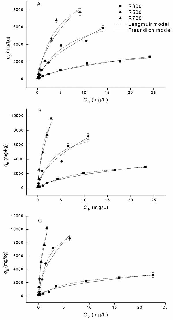 活性炭樣品上四環(huán)素的吸附等溫線如圖1所示。吸附數(shù)據(jù)顯示與Langmuir和Freundlich模型都很好,R 2系數(shù)高于0.919 。對(duì)于Freundlich模型中的參數(shù),不同樣品的n值相近(0.53-0.62),小于1,說(shuō)明吸附是濃度依賴(lài)性過(guò)程。反映樣品吸收四環(huán)素能力的K f的值在700℃熱解產(chǎn)生的活性炭中最高。q max表示的趨勢(shì)Langmuir模型中的值也表明吸附容量隨著熱解溫度的增加而增加。計(jì)算最大吸附容量在大約11,834-14,157mg / kg的范圍內(nèi)。表面積是已知的是影響活性炭的吸附能力的一個(gè)重要因素,尤其在去除四環(huán)素的情況下。這在本研究中得到證實(shí),活性炭樣品的表面積(S BET)與q e值顯著正相關(guān)。在較高的熱解溫度下,活性炭樣品的表面積增加,吸附能力增加。