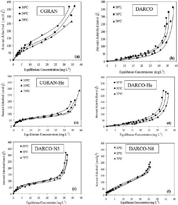 評(píng)估原樣處理的活性炭對(duì)松香酸的吸附情況,結(jié)果如圖1所示。該圖描繪了在處理前和后處理的CGRAN和DARCO活性炭的三種溫度(30,50和70℃)下作為平衡濃度函數(shù)的吸附容量。從先前對(duì)吸附速率的研究(此處未顯示),確定在30分鐘達(dá)到吸附平衡。根據(jù)分類等溫線,CGRAN和CGRAN-He(圖1a和1c)顯示了“L”型等溫線,這是樅酸和吸附位點(diǎn)之間強(qiáng)親和力的特征。DARCO(圖1b)和DARCO-He(圖1d)活性炭表現(xiàn)出“S”型等溫線,歸因于溶質(zhì)和溶劑之間競(jìng)爭(zhēng)吸附的結(jié)果,松香酸對(duì)吸附位點(diǎn)的親和力較低。圖1e和1f所示的HNO3氧化樣品(DARCO-N3和DARCO-N6)的 等溫線為“L”型吸附等溫線,樅酸和溶劑之間具有強(qiáng)親和力的特征。26,27另外,DARCO-N3展示了一個(gè)被歸類為“L2”的等溫線,其中平臺(tái)指示表面上的所有可用位點(diǎn)均分布在單層中,并且DARCO-N6根據(jù)“L1”子群顯示等溫線,其中沒(méi)有觀察到高原,表明未覆蓋單層。 這種行為與DARCO-N6顯示的更多的表面功能組一致。