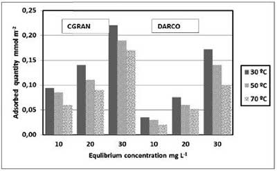 為了確定表面氧基團(tuán)的具體影響,通過(guò)S BET將吸附容量標(biāo)準(zhǔn)化。如圖2所示,CGRAN活性炭具有比DARCO活性炭更高的松香酸吸附容量。在測(cè)試的三個(gè)溫度下觀察到CGRAN的更大的吸附容量。根據(jù)平衡濃度CGRAN的平均吸附能力高2-3倍。然而,由于更大的吸附潛力,這種差異在較高的平衡濃度值下降。表面積歸一化吸附量表明,氧官能團(tuán)的存在對(duì)活性炭的吸附能力起著重要的作用。CGRAN的較高的吸附能力可通過(guò)的強(qiáng)酸位的存在來(lái)解釋(作為較高量的官能團(tuán)的結(jié)果),有利于松香酸的吸附高達(dá)30毫克的L -1。對(duì)于DARCO活性炭來(lái)說(shuō),情況正好相反。