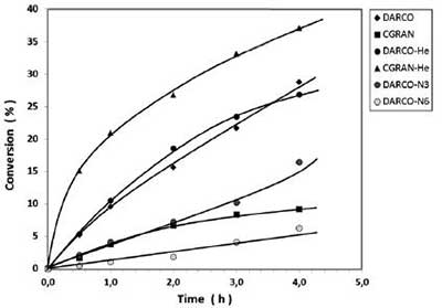 活性炭催化劑的活性在樅酸隨時(shí)間的變化中進(jìn)行測(cè)試,如圖3所示。該圖顯示DARCO催化劑顯示比CGRAN催化劑更高的轉(zhuǎn)化率。圖3還比較了接受活化的碳催化劑與He處理的對(duì)應(yīng)物的轉(zhuǎn)化率:CGRAN-He顯示出比CGRAN催化劑顯著更高的轉(zhuǎn)化率,這是與從TPD,F(xiàn)TIR和酸度結(jié)果推斷的表面氧基團(tuán)數(shù)目較少有關(guān)的行為。DARCO和DARCO-He之間的轉(zhuǎn)化沒(méi)有明顯的差異,這與兩種催化劑中表面氧基團(tuán)的量相似。沿同一線,比較DARCO和相應(yīng)的硝酸氧化樣品的活性,如圖3所示。數(shù)據(jù)清楚地顯示了轉(zhuǎn)化率與HNO 3濃度之間的反比關(guān)系用于改性處理。因?yàn)樵谔幚碇鬀](méi)有明顯的變化,所以質(zhì)地特性的影響可以打折扣; 因此,這種行為顯然是酸強(qiáng)度和表面含氧基團(tuán)的效應(yīng),從TPD,F(xiàn)TIR和總酸度結(jié)果得出的DARCO活性炭表面的化學(xué)修飾的證明。DARCO-N6催化劑的最低轉(zhuǎn)化率可以與它們的最高酸強(qiáng)度相關(guān),而DARCO表現(xiàn)出的最高轉(zhuǎn)化率是由于它們的最低酸強(qiáng)度。這些結(jié)果表明,盡管強(qiáng)酸性位點(diǎn)有利于樅酸的吸附,但是它們會(huì)削弱催化活性。這些發(fā)現(xiàn)也表明這些位點(diǎn)對(duì)于催化裂化沒(méi)有活性。