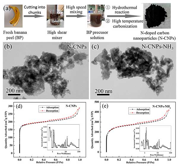 圖1.(a)從新鮮香蕉皮制成活性炭的過(guò)程的描述。(b)活性炭和(c)氨活化的活性炭TEM圖像。(d)活性炭和(e)氨活化的活性炭氮吸附等溫線(xiàn)和相應(yīng)的孔徑分布。