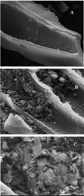 電子顯微鏡是用于研究材料表面形態(tài)的眾所周知的工具。活性炭和改性活性炭的圖像(放大倍數(shù) = 5123×)如圖2所示。由于被鉻黑藍(lán)覆蓋,在簡(jiǎn)單的活性炭和其修改后的改性活性炭之間存在顯著的差異。在鉛離子攝取后,改性活性炭表面在顯微照片中也出現(xiàn)不同(圖2C)。
