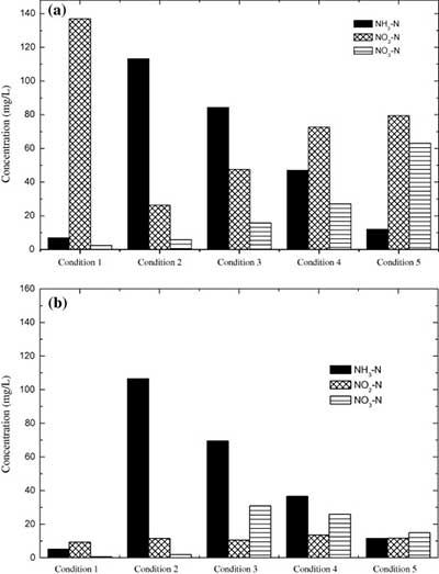圖2。在條件1-5下短程生物脫氮反應器出口的NH 3 -N,NO 2 -N和NO 3 -N濃度對比。(a)好氧隔室和(b)缺氧隔室。