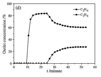 在圖1中可以看出乙烯和乙烷在最初的幾分鐘內(nèi)完全被吸附,但乙烷在8分鐘后穿過管柱。在最初的25分鐘內(nèi),吸附劑保留乙烯,出口物流不含乙烯,然后再通過。最后,50分鐘后出口氣體濃度返回到進(jìn)料氣體濃度,表明該吸附劑樣品飽和。乙烯的吸附量是通過整合相關(guān)穿透曲線獲得的。