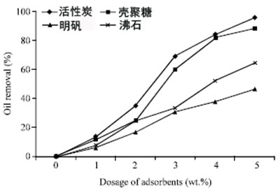 通過改變吸附劑的重量,以100rpm的混合速率,1小時,分析不同吸附劑用量(wt。%)對活性炭與沸石相比對MEA去除殘留油的影響;旌蠒r間,在25-30℃的溫度下接觸時間為1小時。測試在樣品的原始pH下進行,即11.21。在CO 2去除單元系統(tǒng)中根據(jù)需要維持pH水平。圖1顯示了使用活性炭和沸石從MEA廢水中去除殘留油的百分比。從圖1中可以看出觀察到,在最高吸附劑用量(5重量%)下,活性炭與其他物質(zhì)相比顯示出最高的殘油去除率;钚蕴砍晒Τ87%的殘油,沸石為46%。可以得出結(jié)論,活性炭最好比其他吸附劑更好地除去殘油。