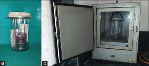 圖3:(a)然后將瓊脂平板置于氣體包裝罐中進(jìn)行厭氧培養(yǎng)。(b)然后將氣體包裝罐置于培養(yǎng)箱中48小時(shí)。