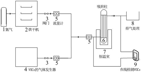 在吸附柱中研究了活性炭吸附甲苯的能力;钚蕴康挠昧繛10g,吸附質(zhì)甲苯氣體由氣體發(fā)生器產(chǎn)生。通過測定吸附前后甲苯的濃度,得到了不同條件下活性炭吸附性能的數(shù)據(jù)。實驗吸附裝置的流程圖如圖2所示。將來自氣體發(fā)生器的甲苯氣體與氮氣混合,然后將其吸附在恒溫吸附塔中。通過在線FID檢測器測量吸附前后的甲苯含量,并通過流量計控制甲苯流量。當(dāng)脫氣和入口濃度在30分鐘內(nèi)保持一致時,認為已達到吸附平衡。吸附氣體通過廢氣出口排空。