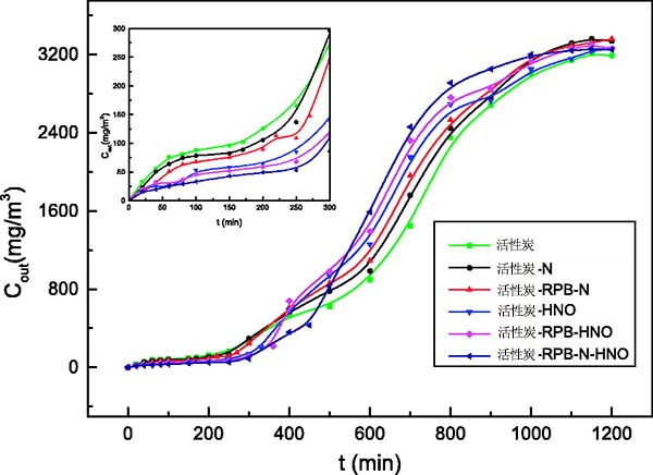 甲苯在不同活性炭上的穿透曲線和吸附等溫曲線如圖3所示和4。不同活性炭上的吸附速率從高到低依次為:活性炭-RPB-N-HNO>活性炭-RPB-HNO>活性炭-HNO>活性炭-RPB-N>活性炭-N>原始活性炭。吸附速率越大,滲透時間越長,這又與活性炭的復(fù)雜孔徑分布和表面官能團的量有關(guān);钚蕴康奈⒖左w積在高溫氮氣中增大,這增加了活性炭通道的內(nèi)部孔隙體積。在高重力氮氣環(huán)境中,不利于甲苯吸收的原始活性炭的內(nèi)部結(jié)構(gòu)被重新分配并分裂成新的空間構(gòu)型,這進一步增加了突破時間。HNO 3處理的活性炭的突破時間在高重力環(huán)境中的改性大于具有HNO 3浸泡的改性活性炭。這是因為HNO 3分散的細小液滴中,這增加了其與活性炭的表面和內(nèi)部的接觸概率,這反過來增強了活性炭上含氧官能團的負載并增加了它們的吸附效率。在重力作用下,復(fù)合改性處理的活性炭具有較長的穿透時間和較大的吸附速率,因為物理改性增加了比表面積,增大了孔體積分布,而化學(xué)改性增加了表面氧基團數(shù)。反過來,這些特性增強了吸附性能。