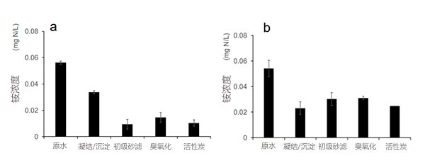圖1:兩種樣品中原水中的銨濃度和水凈化過程的流出物(即沒有預(yù)氯化(a)和預(yù)氯化(b)。