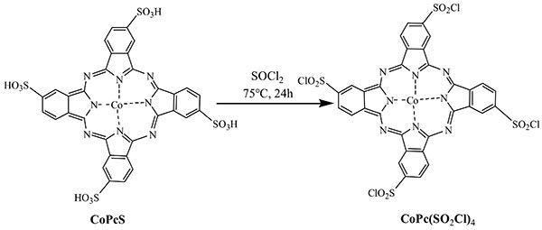 圖2.通過(guò)亞砜氯化物制備改性磺化鈷酞菁的示意圖。