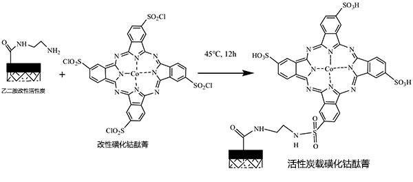 活性炭本身的孔隙結(jié)構(gòu)發(fā)達(dá),擁有大的比表面積和高吸收率與穩(wěn)定性。然而,活性炭按平常的方法浸漬磺化酞菁鈷催化劑會(huì)存在負(fù)載型催化劑的活性成分損失的問(wèn)題,導(dǎo)致再利用性能不令人滿意。因此,應(yīng)通過(guò)化學(xué)接枝方法在活性炭上載入CoPcS。