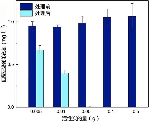 圖2顯示了在不調(diào)節(jié)單一體系中的聚乙醛溶液的pH的情況下處理前后的四聚乙醛濃度?梢钥闯觯行У爻チ司垡胰,特別是在活性炭劑量較高的情況下。單因素統(tǒng)計(jì)檢驗(yàn)證實(shí),在活性炭處理2小時之前和之后,乙醛濃度之間存在顯著差異(p<0.05)。當(dāng)活性炭用量從0.005g增加到0.05g時,去除甲醛的百分比從30.3%增加到99.6%。當(dāng)PAC用量高于0.05 g時,處理后未檢測到乙醛,表明其濃度低于檢測到的聚乙醛(1~5μgL-1)。