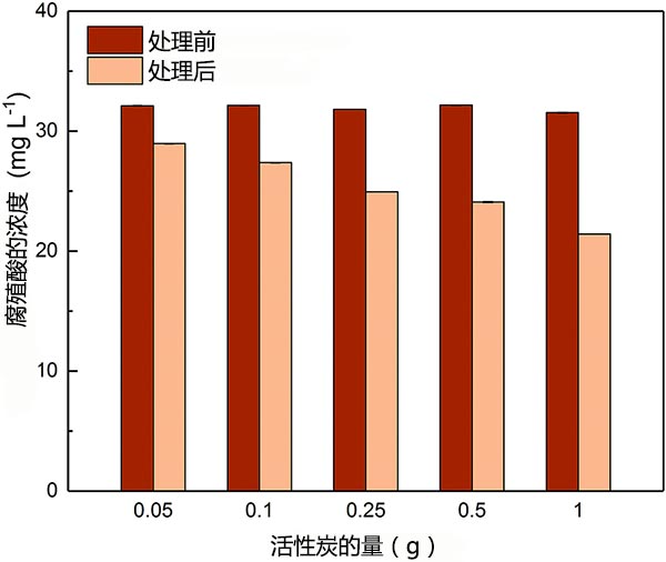 圖3顯示了不同劑量的活性炭處理之前和之后的HA濃度。通過在活性炭上吸附適度除去HA。隨著活性炭劑量的增加,HA的去除百分比范圍為9.8%至32%。雖然處理前HA的初始濃度(C 0=30 mg L-1)遠(yuǎn)高于聚乙醛(C 0=1 mg L-1),但高劑量的活性炭(例如1g)在2小時內(nèi)也只能去除32%的HA。
