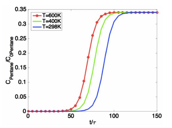 結(jié)果與討論我們已經(jīng)提出了一個綜合模型,該模型定量地預(yù)測了填充床反應(yīng)器中油蒸氣回收的吸附動力學(xué)。在該模型中,我們僅考慮軸向擴(kuò)散,并使用質(zhì)量守恒方程來模擬油氣吸附的時空分布。我們假設(shè)活性炭吸附在恒溫下操作,并且與活性炭的吸附容量相比,油蒸氣濃度非常低。此外,假設(shè)油蒸氣中的組分之間不發(fā)生化學(xué)反應(yīng),因此每種組分可以作為獨(dú)立的吸附物處理。因此,多組分吸附問題可以轉(zhuǎn)化為單組分吸附問題。下圖(圖2)說明了吸附動力學(xué)的溫度依賴性。