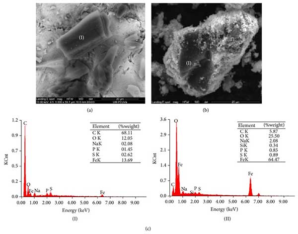 圖2(a)活性炭顯微照片,(b)磁性改性活性炭載體的顯微照片,(c)從磁性改性碳載體的區(qū)域I和II的分析獲得的能量色散譜。