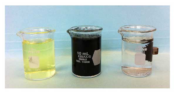圖3吸附實驗從左至右:檸檬黃的溶解,酒石黃與活性炭的混合物和磁性載體分離。