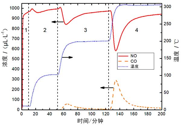 活性炭表面的NO吸附是活性炭脫硝的前提。溫度對(duì)活性炭脫硝能力有很大影響。因此,本文首先研究了活性炭對(duì)單組分NO在15-300℃范圍內(nèi)的去除能力。如圖2所示,根據(jù)溫度分為四個(gè)階段,分別為15°C,15-100°C,100-200°C和200-300°C,進(jìn)氣量為1000μL/L NO/N 2。出口NO在15°C下10分鐘內(nèi)達(dá)到970μL/L。改性活性炭纖維用于研究活性炭纖維在40℃下的脫硝能力。當(dāng)入口氣體為900μL/L NO/N 2時(shí),出口NO在5 min內(nèi)達(dá)到800μL/L,然后緩慢增加。我們的結(jié)果與他的相似。我們知道低溫有助于活性炭的物理吸附,并且通常活性炭纖維具有比活性炭更大的比表面積。因此活性炭纖維的物理吸附能力強(qiáng)于活性炭。然而,活性炭纖維和活性炭的NO吸附量在低溫下仍然受到限制。隨著溫度的升高,活性炭的物理吸附能力逐漸降低,化學(xué)吸附能力和催化能力逐漸提高。因此,為了提高活性炭的脫硝能力,還需要優(yōu)化其催化能力。