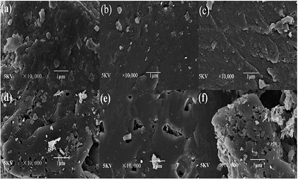 從表面形態(tài)分析不同煤和活性炭的SEM圖像如圖2所示。它表明三種活性炭的表面相對光滑,沒有任何毛孔,除了偶爾的裂縫。在活化后,三個活性炭的外表面都顯示出不規(guī)則的孔。活性炭的表面相對粗糙并且表現(xiàn)出更多的孔。而具有低灰分和揮發(fā)性物質(zhì)含量的炭2顯示出相當(dāng)光滑的表面。可能是在氣化過程中形成的金屬鉀可以擴(kuò)散到碳基質(zhì)的內(nèi)部結(jié)構(gòu)中,從而擴(kuò)大現(xiàn)有的孔隙并產(chǎn)生新的孔隙。