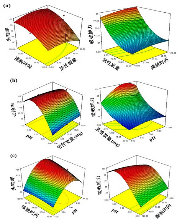 圖3:表面響應圖吸附參數(shù)對去除和吸收能力的影響(a)活性炭劑量與接觸時間的相互作用;(b)活性炭與pH之間的相互作用;(c)相互作用pH值與接觸時間。