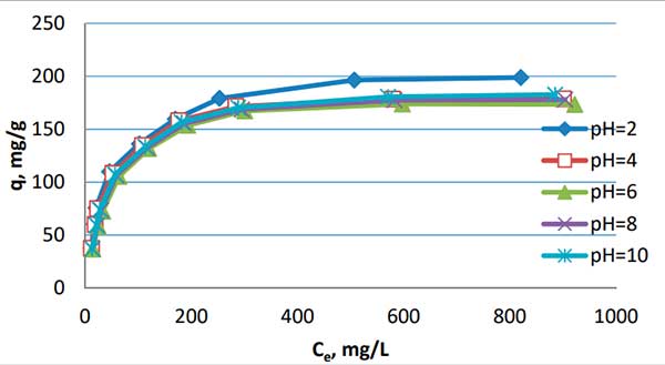 3.還發(fā)現(xiàn)了pH對(duì)活性炭的吸附效率的不顯著影響。觀察到與接近中性的溶液相比,酸性和堿性溶液的吸附更好。大量吸附是從pH=2的溶液中獲得的,但與pH=6的溶液的吸附相比,所獲得的吸附容量?jī)H高9%。