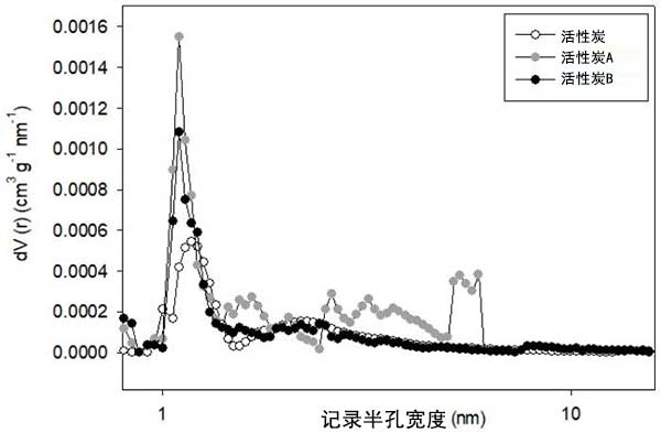 可以觀察到,由于在解吸分支中形成的小磁滯回線,活性炭普遍具有微孔性,這表明毛細孔凝結(jié)很小,因此中孔的量較少。通過QSDFT方法獲得這幾種活性炭的總體積和孔徑分布,假設(shè)孔為狹縫圓柱形。圖2顯示了三種研究的活性炭的孔徑分布,可以確認,對于所有活性炭樣品,主要存在于1.0-1.5nm區(qū)域的微孔,而對于活性炭A,也可以檢測到少量的中孔。