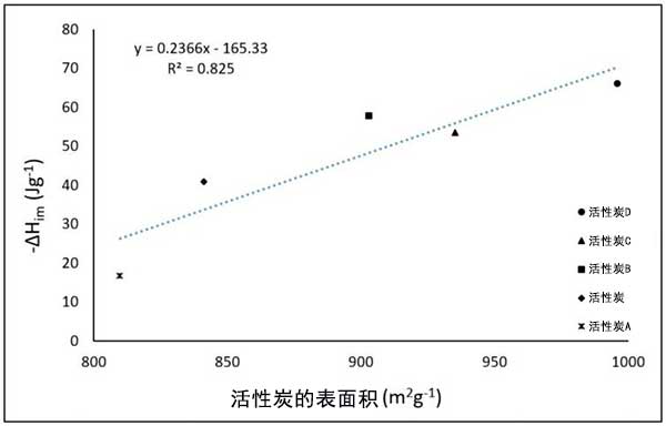 圖3:作為表面積的函數(shù),活性炭在己烷中的浸入焓。