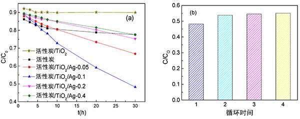 圖2:(a)這幾種活性炭的亞甲基藍(lán)去除效果,(b)經(jīng)歷循環(huán)試驗(yàn)的活性炭含銀纖維的亞甲基藍(lán)去除效果。