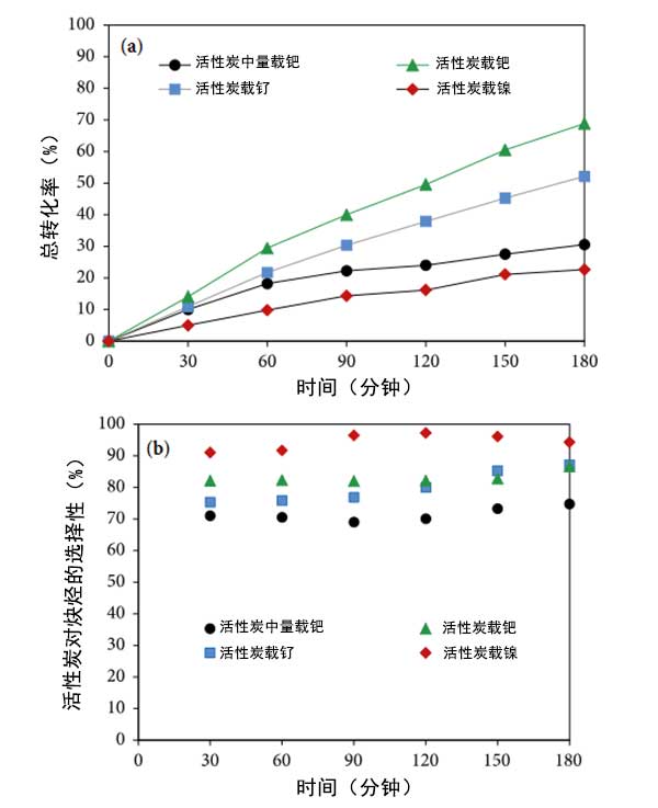 圖3:在120℃的氫中預(yù)處理的幾種活性炭催化劑的總轉(zhuǎn)化率(a)和炔烴(b)對(duì)時(shí)間的選擇性。