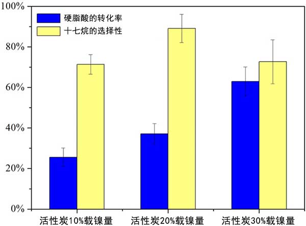 在相同的實(shí)驗(yàn)條件下在三種活性炭載鎳催化劑上檢測(cè)硬脂酸的脫羧作用,其中鎳負(fù)載量不同(10%,20%和30%);钚蕴康逆囏(fù)載對(duì)硬脂酸轉(zhuǎn)化率和十七烷選擇性的影響如圖2所示。從圖中可以看出,硬脂酸的轉(zhuǎn)化率隨著活性炭上鎳負(fù)載量的增加而增加。十七烷的選擇性超過(guò)20%載鎳量的活性炭遠(yuǎn)高于10%和30%載鎳量的活性炭。經(jīng)過(guò)活性炭催化后得到產(chǎn)物除十七烷外,還檢測(cè)到其他產(chǎn)物如癸烷,十一烷,十二烷,十三烷,十四烷,十五烷,十六烷,十七烷,十八烷和十八烷醇。