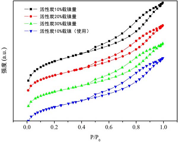 為了研究活性炭載鎳催化劑的可重復(fù)使用性,首先在真空下過(guò)濾分離先前實(shí)驗(yàn)的廢活性炭,然后用丙酮徹底洗滌,接著用水洗滌多次。然后將過(guò)濾的活性炭在強(qiáng)制通風(fēng)烘箱中在110℃下干燥,然后在管式爐中在氮?dú)饬飨略?00℃下煅燒4小時(shí)。經(jīng)過(guò)從新活化的活性炭的測(cè)試,活性炭對(duì)硬脂酸的產(chǎn)率和選擇性轉(zhuǎn)化為十七烷在重復(fù)三次催化后性能幾乎沒(méi)有下降。選擇性保持在約90%,在無(wú)溶劑體系中保持穩(wěn)定;钚蕴康腘2吸附-脫附等溫線如圖3所示,表明隨著鎳負(fù)載量的增加,活性炭的表面積和孔體積減小,表明過(guò)量的鎳顆?赡茏枞欢康幕钚蕴靠撞p少孔體積。