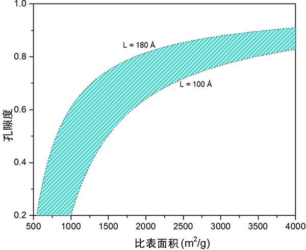 以前提出的活性炭微孔率模型將表面積和孔隙率作為兩個(gè)獨(dú)立變量處理。通過將石墨烯片的長(zhǎng)度限制在100和180之間,并通過改變石墨中石墨烯層的平均數(shù)量,我們計(jì)算孔隙率和比表面積之間的關(guān)系。圖2顯示了孔隙率和表面積之間的關(guān)系。