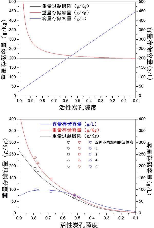 圖4顯示了兩種活性炭的重量和體積存儲(chǔ)容量之間的相互依賴性。實(shí)驗(yàn)吸附測(cè)量與第二模型一致,將孔隙率和表面積作為因變量處理。經(jīng)過對(duì)比活性炭樣品的實(shí)驗(yàn)性過量吸附,重量?jī)?chǔ)存容量和體積儲(chǔ)存容量。圖3和圖4將理論模型與實(shí)驗(yàn)數(shù)據(jù)進(jìn)行比較。它表明,所開發(fā)的模型是通用的,并預(yù)測(cè)任何活性炭樣品的重量和體積儲(chǔ)存容量之間的相互依賴性。結(jié)果也適用于金屬有機(jī)骨架。雖然實(shí)驗(yàn)結(jié)果比較好的活性炭不具有較高的表面積,但孔隙率在0.65和0.75之間。通過使用化學(xué)粘合劑將活性炭粉末壓縮成整料,實(shí)現(xiàn)了更高的體積儲(chǔ)存容量。整體的體積儲(chǔ)存容量使用整體式整體密度而不是活性炭的表觀密度或金屬有機(jī)框架材料的單晶密度來計(jì)算。