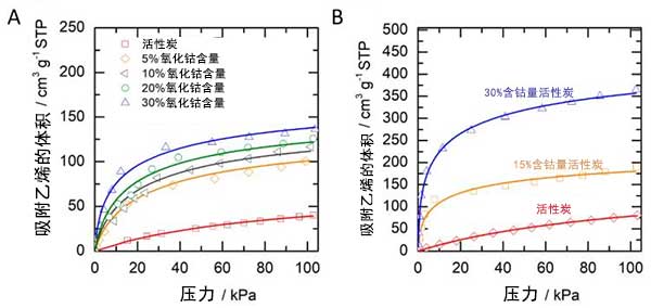 測試氧化鈷浸漬的活性炭的性能以進(jìn)行乙烯吸附。圖2A顯示在具有和不具有0-101kPa壓力范圍的氧化鈷活性炭中的乙烯吸附等溫線。吸附乙烯的體積定義為標(biāo)準(zhǔn)溫度和壓力下的體積。通常,可以看出乙烯吸收隨著壓力的增加而增加。大量乙烯吸附至40kPa壓力。當(dāng)將壓力增加到40kPa以上時,所有樣品可以進(jìn)一步吸附少量乙烯(添加10%-25%)。氧化鈷浸漬的活性炭是無負(fù)載的活性炭兩倍的乙烯吸附量,它清楚地表明氧化鈷在增強(qiáng)活性炭對乙烯吸附方面效果比較好。增加氧化鈷的含量進(jìn)一步增加了乙烯在氧化鈷浸漬的活性炭上的吸附能力。當(dāng)使用30%氧化鈷時能達(dá)到較高吸附容量。