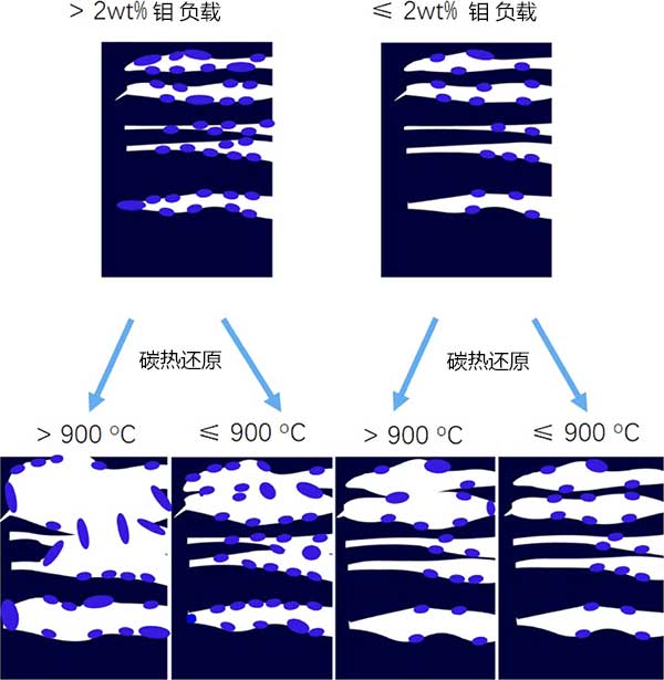 圖4:具有不同鉬負載和碳熱還原溫度的活性炭的孔發(fā)展過程圖。