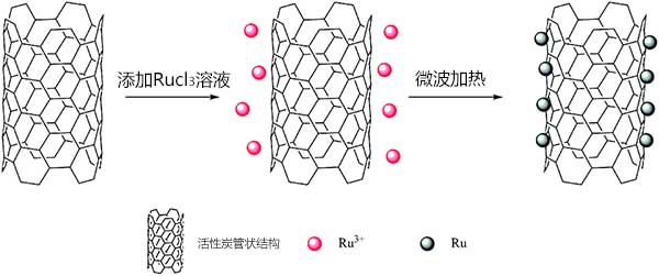 所有載釕活性炭上的釕負(fù)載量理論上為5%。通常,將活性炭加入120mL乙二醇中。并將混合物在超聲處理30分鐘以確保活性炭均勻分散。超聲處理后,在連續(xù)攪拌下滴加3.0mL RuCl 3水溶液30分鐘。然后是使用NaOH乙二醇溶液將混合物的pH調(diào)節(jié)至4.0。然后,在連續(xù)攪拌24小時后,將溶液放入微波合成反應(yīng)器中加熱100秒。過濾混合物溶液,用去離子水洗滌直至濾液的pH達(dá)到7.0,并在80℃下真空干燥。將樣品研磨成粉末使用。由于活性炭的表面是疏水的,它們傾向于在極性溶劑中聚集。并且由官能團(tuán)改性的活性炭可以提供足夠的孔隙以使釕納米顆粒均勻地分布在活性炭的表面上。在通過微波加熱的多元醇方法制備活性炭負(fù)載的釕納米顆粒。合成過程如圖1所示。