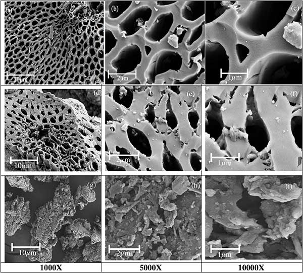FESEM:三種活性炭在不同放大倍數(shù)下的顯微圖像顯示在圖3中?展钚蕴繕悠樊a(chǎn)生的蜂窩狀圖案孔隙網(wǎng)絡(luò)與優(yōu)化的碳納米管相似。油棕纖維活性炭上的孔也類似于空果束活性炭的蜂窩圖案。然而,與油棕纖維炭和棕櫚仁殼炭相比,空果束炭中的孔網(wǎng)絡(luò)更加突出和發(fā)展。棕櫚仁殼活性炭樣品顯示出很少的隧道孔,并含有阻塞毛孔的可見微塊。發(fā)達的多孔網(wǎng)絡(luò)表明可以沉積吸附物或離子的高表面積。