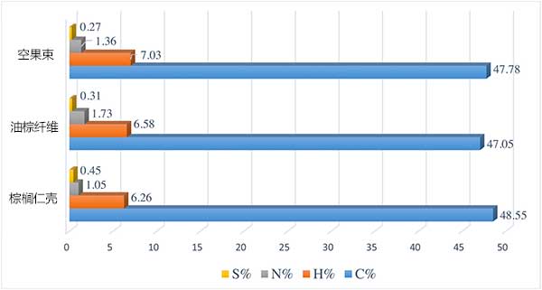 CHNS分析:在碳化和活化之前分析預處理活性炭的元素組成。圖4顯示了預處理樣品的定量元素分析的圖示。碳是所有樣品中最突出的元素,棕櫚仁殼,空果束和油棕纖維分別為48.55%,47.78%和47.05%。空果束含有7.03%的氫和1.36%的氮。油棕纖維含有6.58%的氫,1.73%的氮,而棕櫚仁殼含有6.26%的氫和1.05%的氮。對于所有活性炭樣品,硫含量不太重要,因為它們含量低于1%。