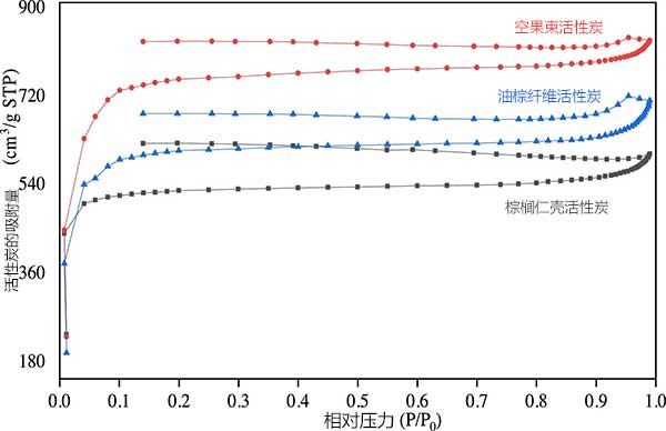 BET表面積和孔徑分布:所述吸附物在物理吸附過程中使用是氮氣。吸附和解吸等溫線用于估計每個活性炭的表面積和孔分布。圖5顯示了三種活性炭的等溫線圖。在低相對壓力下在所有樣品上觀察到開放式II型滯后曲線。據(jù)說,當前體碳化過程中不完全燃燒導致孔隙收縮時,這種開口性和低相對壓力下的低吸附性隨著相對壓力的增加而增加]。