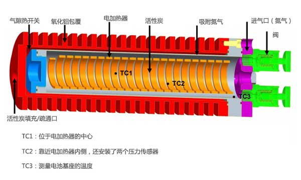 排出壓力約為3.5MPa的實(shí)驗(yàn)結(jié)果如圖4所示。250秒后,加熱功率為500W,中心溫度超過(guò)476℃,而電池底座溫度則為76℃。然而,將電池達(dá)到其穩(wěn)態(tài)溫度分布需要大約60分鐘,其中電池基座中的溫度為166℃;钚蕴康臏囟炔辉试S超過(guò)526℃。 60分鐘,加熱功率逐漸降低,以保持最高溫度低于526℃,壓力高于3.5MPa。由于電池基座的溫升速率隨時(shí)間降低,輸送的氮量也減少了。因此,在15分鐘后結(jié)束放電階段僅從活性炭吸附池釋放4.6g氮。圖4中的冷卻階段持續(xù)約100分鐘,并且如果放電階段在15分鐘后結(jié)束(此時(shí)基礎(chǔ)溫度僅為126℃),則可以減少冷卻階段;钚蕴恐械募訜岷屠鋮s速率以及溫度分布與數(shù)值分析估計(jì)的相似。這表明簡(jiǎn)化的數(shù)值傳熱分析為吸附池中的傳熱提供了令人滿意的估計(jì)。
