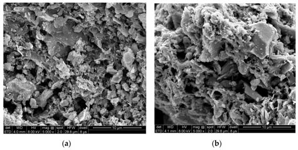 圖2:(a)化學(xué)活化和(b)物理活化的活性炭掃描電子顯微鏡(SEM)圖像。