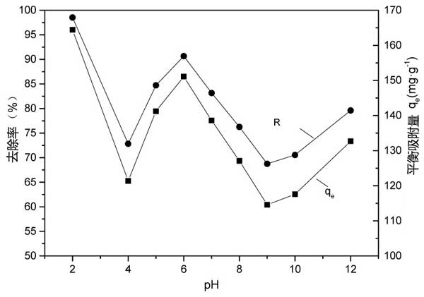 pH對(duì)活性炭吸附鉻黑T的影響:用3.00g·L-1活性炭懸浮于含有500mg·L-1鉻黑T的50mL溶液的8個(gè)燒杯中進(jìn)行pH效應(yīng)實(shí)驗(yàn),pH設(shè)定為2.0-12.0。將混合物在25℃的溫度下在振蕩器上平衡48小時(shí)。吸附后,用孔徑為0.45μm的聚醚砜膜過濾混合物,測(cè)定鉻黑T水溶液濃度。根據(jù)結(jié)果,我們確定了合適的pH值。