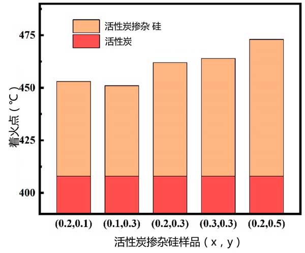 燃點(diǎn):在不同條件下獲得的原料和復(fù)合材料的著火點(diǎn)如圖3所示。觀察到硅摻雜到活性炭中會使點(diǎn)火溫度升高至少40℃。這種制備活性炭載硅復(fù)合吸收材料的方法有益于改善阻燃性。