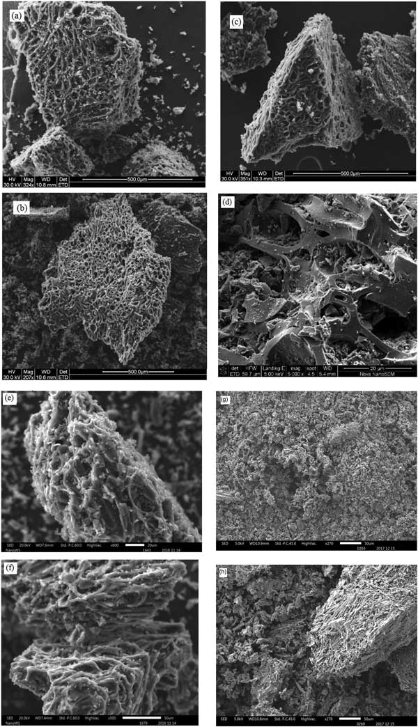 掃描電子顯微鏡圖像顯示在圖1a-h中。活性炭的磷酸處理導(dǎo)致具有可見孔隙率的材料(圖1a-c)。然而,仔細(xì)觀察后,孔隙結(jié)構(gòu)和尺寸是不同的。20%濃度改性后的活性炭具有稍微細(xì)長(zhǎng)的孔,40%表現(xiàn)出均勻的圓形孔,而60%顯示出細(xì)長(zhǎng)和圓形毛孔的混合。這些觀察結(jié)果表明,不同濃度的磷酸活化的活性炭具有不同的物理屬性。在這種情況下,磷酸是活化劑,并且在加熱時(shí)產(chǎn)生孔道,因?yàn)樗鼜奶贾幸莩,從而帶走一些萃取劑。圖1d描繪了具有小孔的粗糙紋理,圖1e顯示了類似巢的類型的孔,圖1f顯示了孔的破壞和變寬。孔結(jié)構(gòu)和孔體積的變化可歸因于活化劑的強(qiáng)度增加。濃度較高的硝酸會(huì)破壞表面基團(tuán)。因此,需要使用最佳濃度的活化劑來(lái)防止損害吸附劑的表面特性。濃度太高可能導(dǎo)致結(jié)合官能團(tuán)的提取,使吸附劑吸附性差。