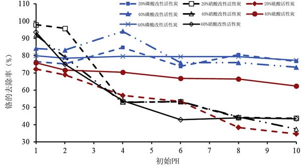 對(duì)鉻實(shí)現(xiàn)有效吸附所需的較高劑量可能意味著用硝酸,硫酸對(duì)活性炭進(jìn)行化學(xué)氧化和磷酸除去吸附位點(diǎn)。具體地,當(dāng)考慮所用的劑量和初始濃度時(shí),硫酸和磷酸改性產(chǎn)生的活性炭與沒(méi)改性的相比具有較差的性能。因此,基于使用不同前體的研究,不能推廣酸改性對(duì)活性炭性能的影響。對(duì)于不同濃度硫酸磷酸改性和20%硝酸改性活性炭,在pH 1下各種吸附劑的處理能力都超過(guò)75%最大的硝酸改性活性炭達(dá)到了98%,而磷酸改性活性炭的那些性能最大?偟膩(lái)說(shuō),20%硝酸改性的活性炭才是去除鉻的最佳吸附劑。